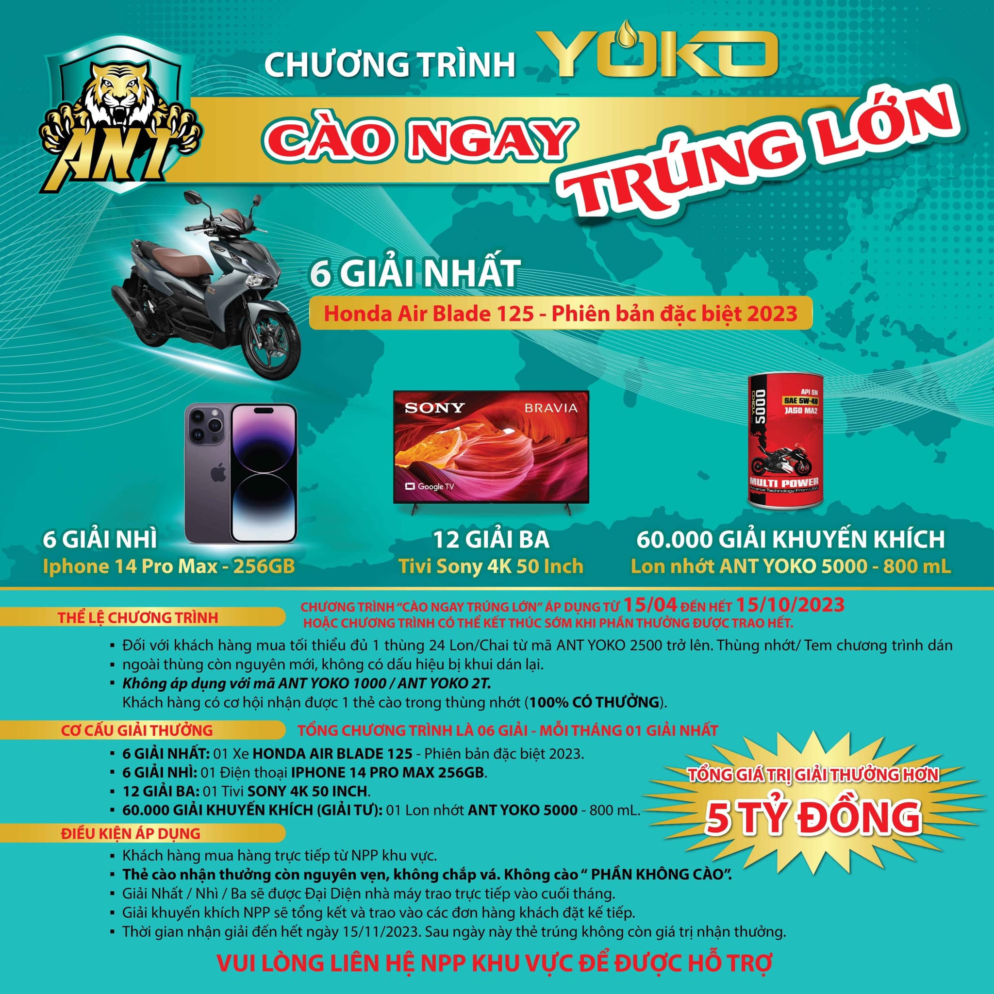 Chương trình “Cào ngay trúng lớn” của ANT Yoko được áp dụng từ ngày 15/04/2023 đến hết ngày 15/10/2023 (hoặc chương trình có thể kết thúc sớm khi phần thưởng được trao hết) với hàng nghìn giải thưởng cùng với những quà tặng hấp dẫn đang đợi quý khách hàng sở hữu. Đặc biệt “CÀO…